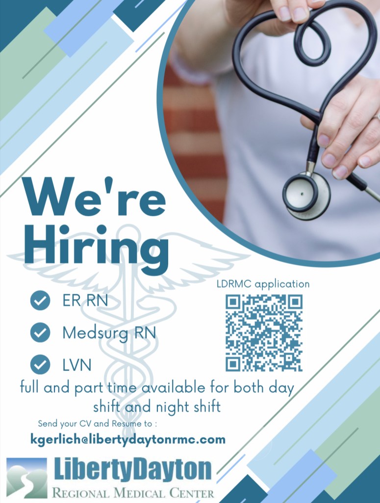 As we continue to expand our services, Liberty Dayton Regional Medical Center is in search of nursing staff that have a passionate drive for patient care! We have openings in our ER and our inpatient departments.