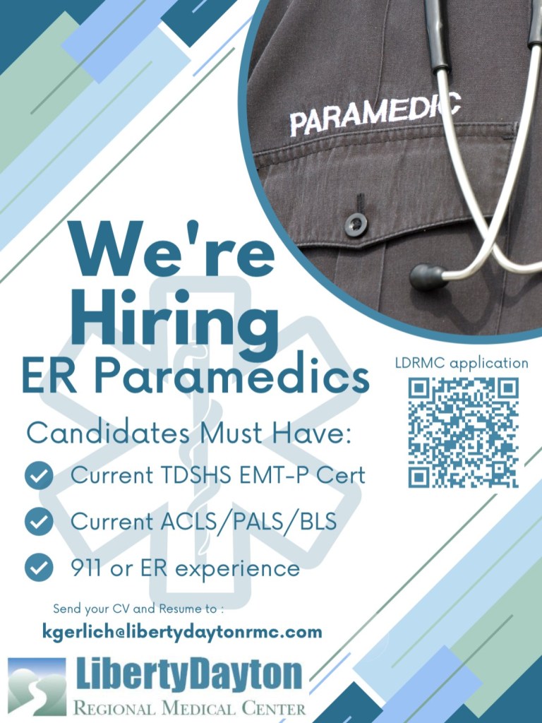 We currently have positions available for ER paramedics. We offer 12 hour shifts (day/night) and competitive pay!