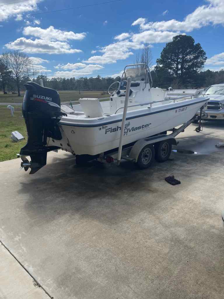 2002 Fishmaster Travis Edition 21 ft bay boat for sale. Equipped with 2001 Suzuki 140 4-stroke engine. Also has trolling motor and fish finder. Everything works on boat. Single owner.